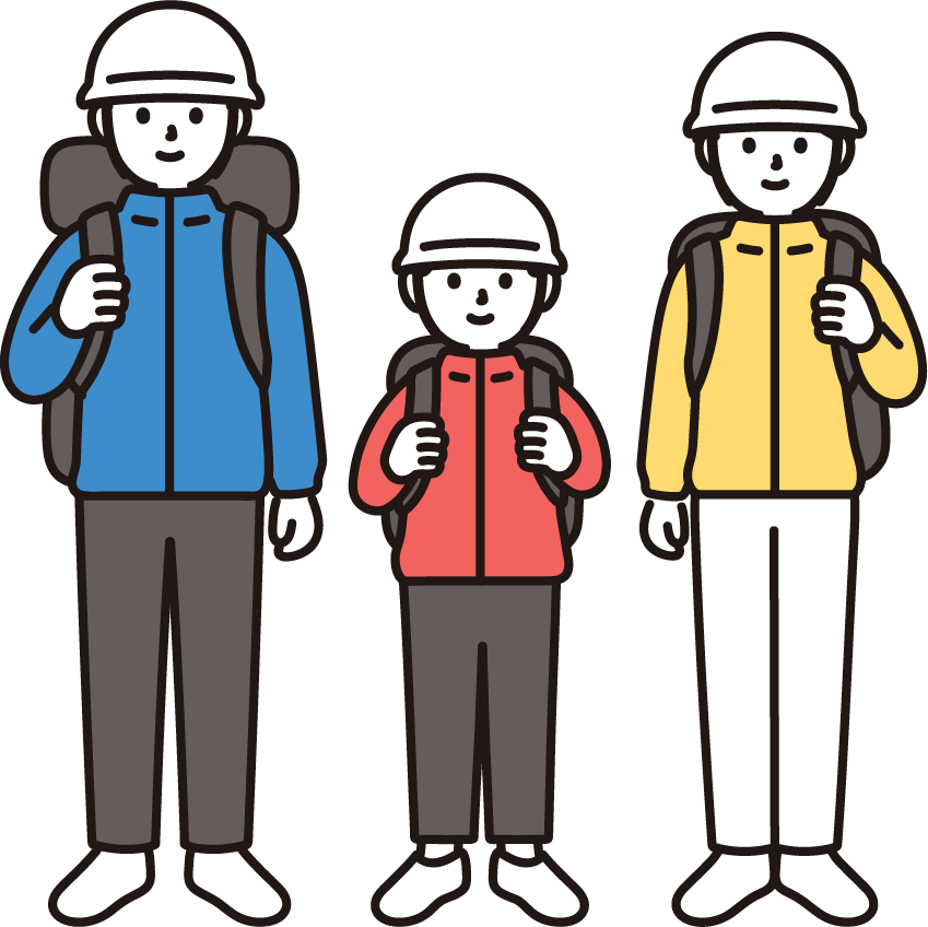 ヘルメットを着用し、防災リュックを背負った家族のイラストです。地震、災害。