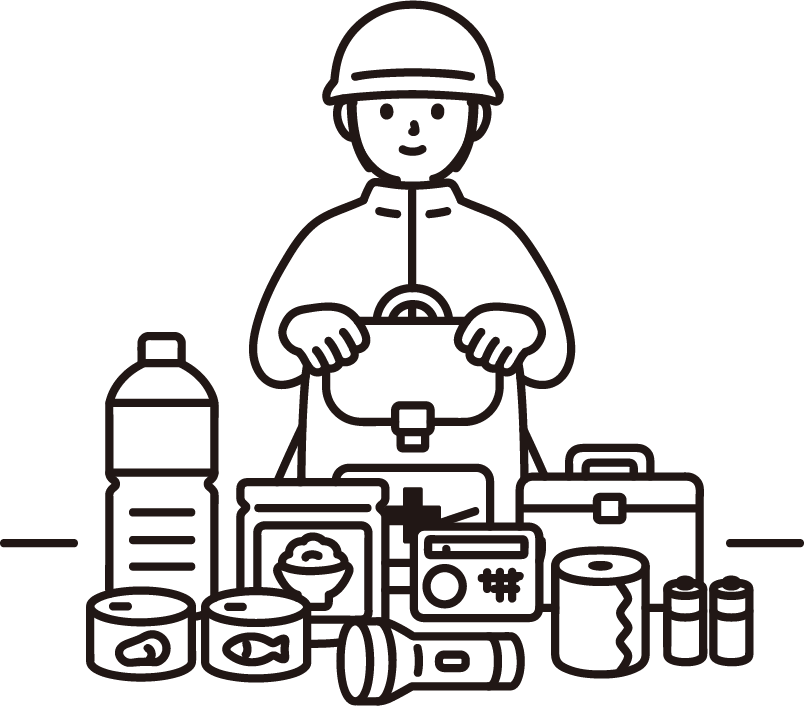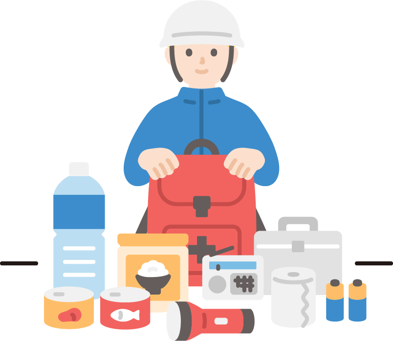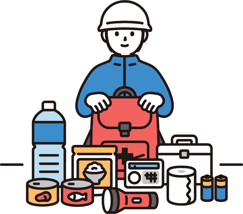 防災グッズを準備している人のイラストです。ヘルメット、防災備蓄。
