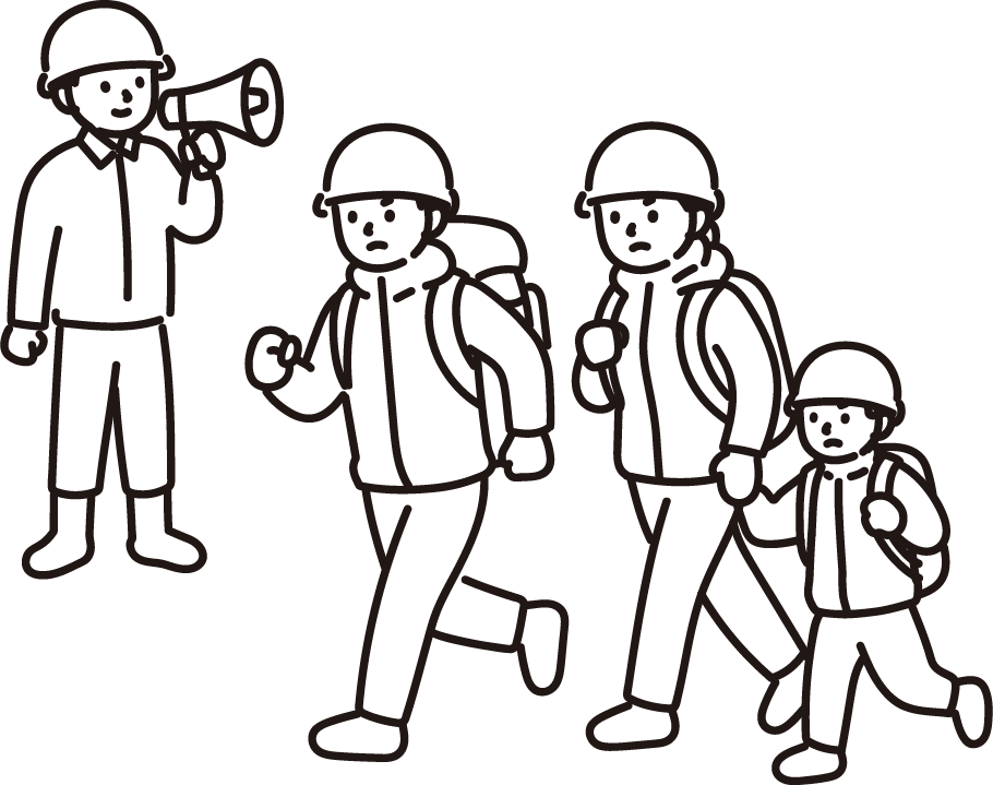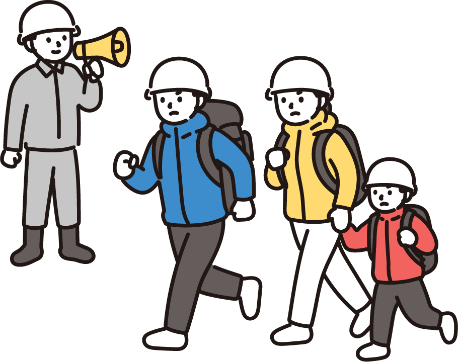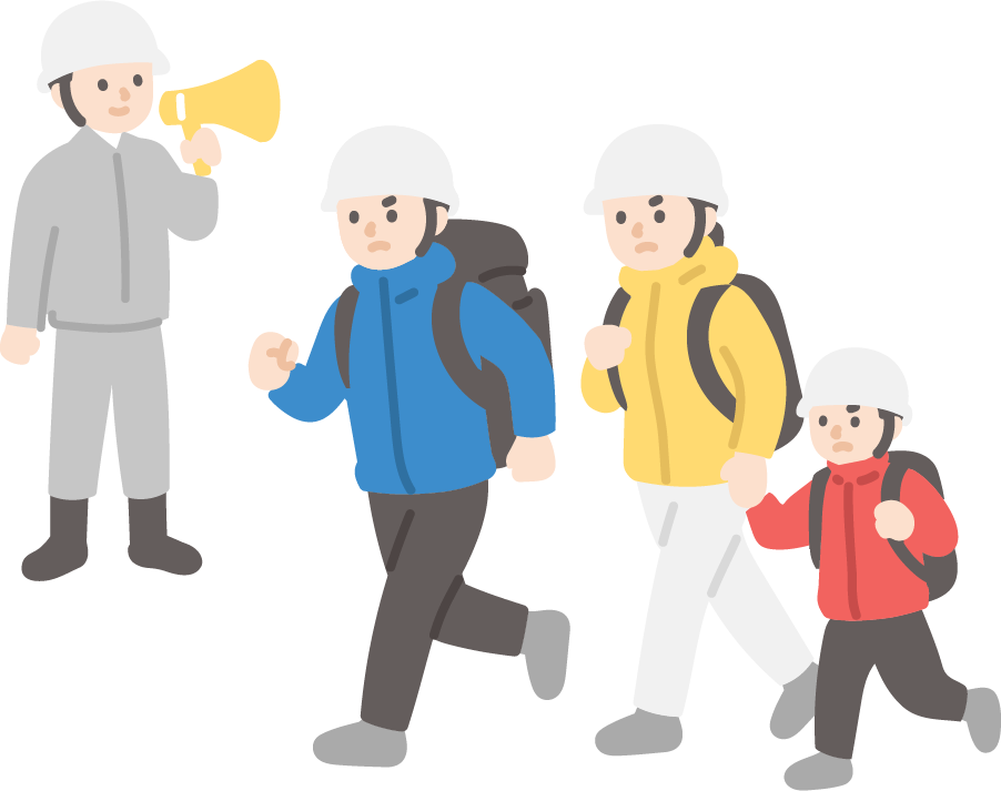 避難する人と誘導している人のイラストです。地震、災害、避難訓練。