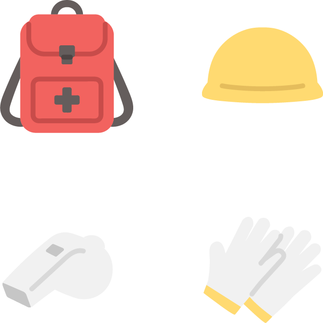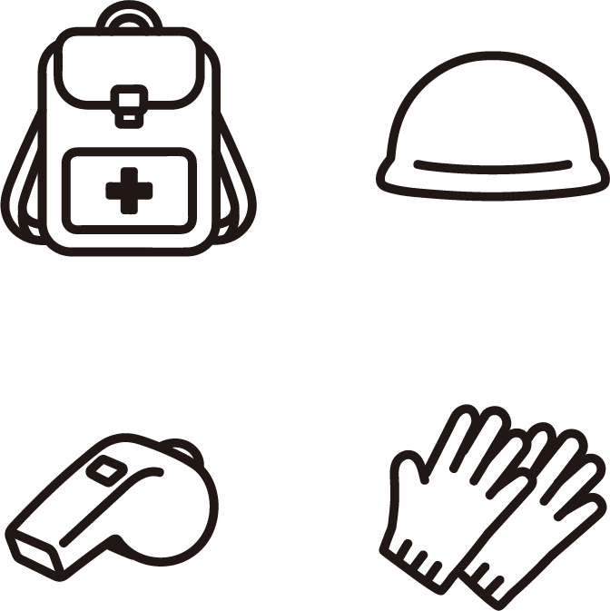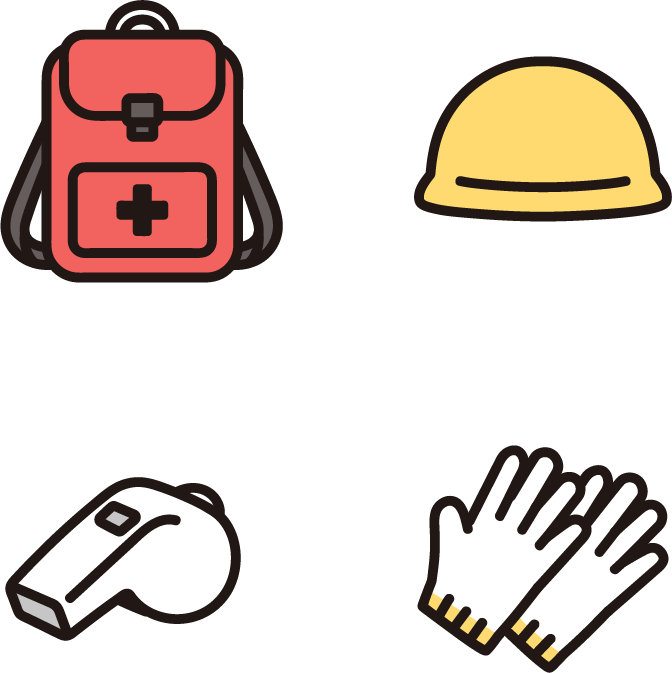 「防災リュック、ヘルメット、笛(ホイッスル)、軍手・手袋」の防災系のアイコンです。地震、災害。