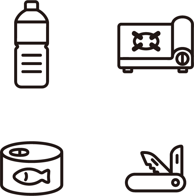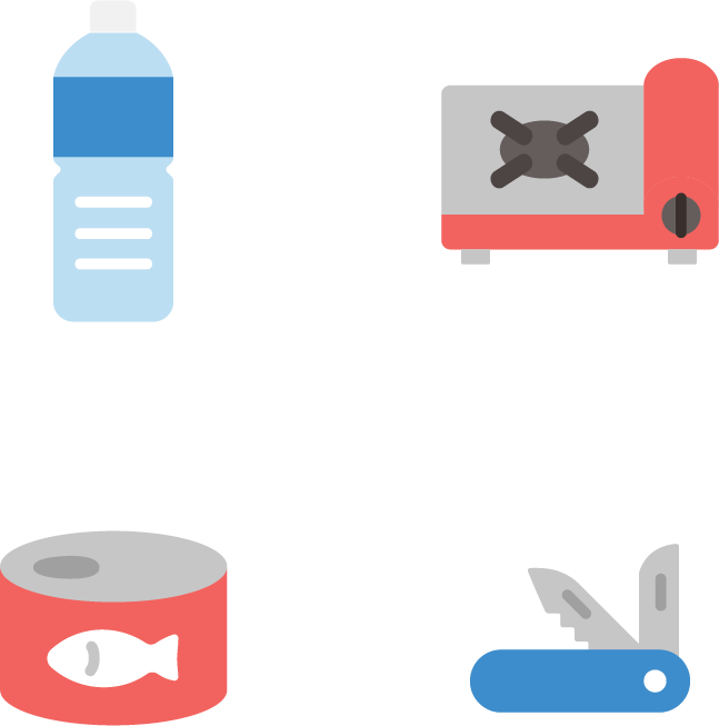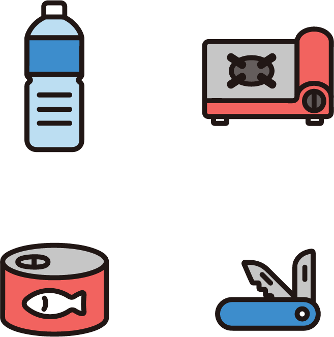 「水(ペットボトル)、ガスコンロ、非常食(缶詰)、携帯ナイフ」の防災系のアイコンです。地震、災害。