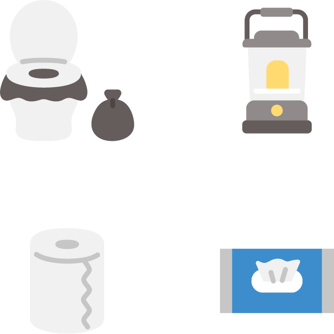「非常用トイレ、ランタン、トイレットペーパー、アルコールウェットティッシュ」の防災系のアイコンです。地震、災害。