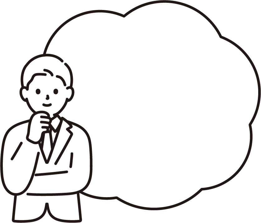 笑顔で何かを思い浮かべているビジネスパーソンの男性のイラストです。横に大きな吹き出し(ふきだし)。