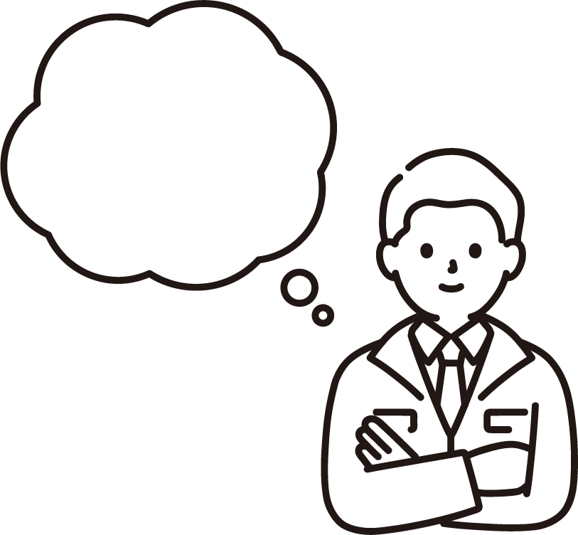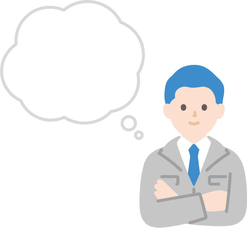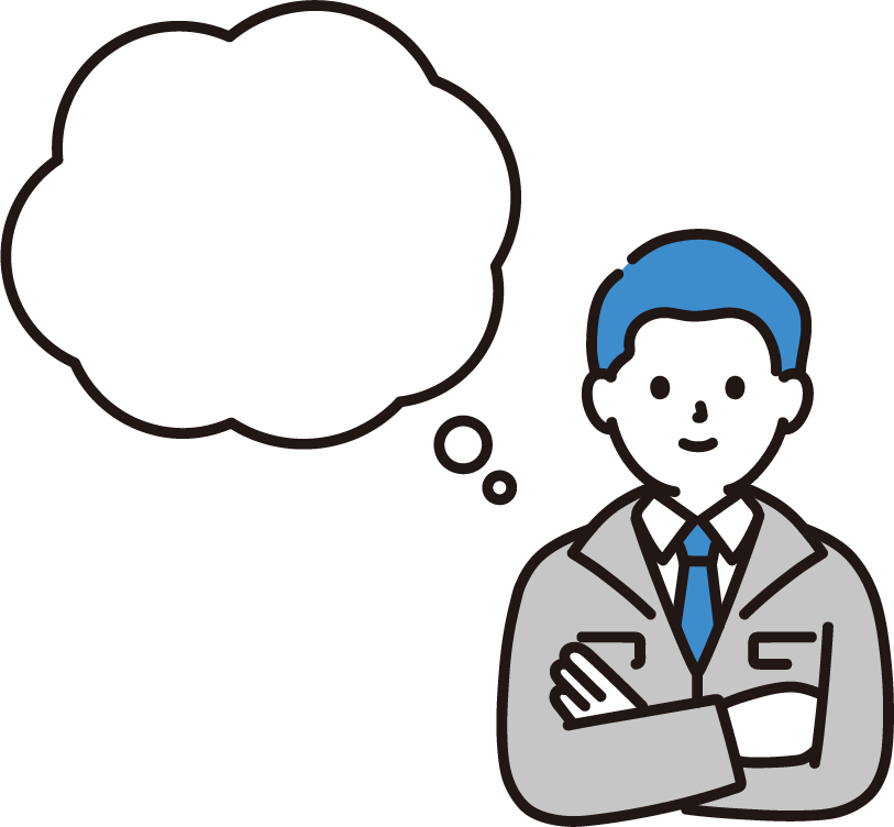 腕を組んで笑顔で何かを思い浮かべている作業着男性のイラストです。左上に吹き出し(ふきだし)。