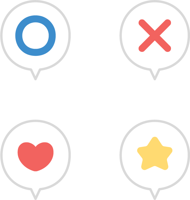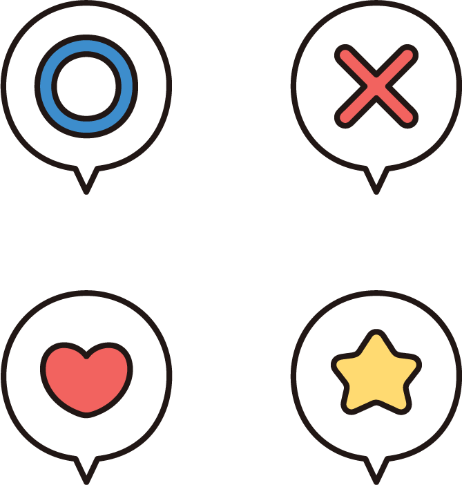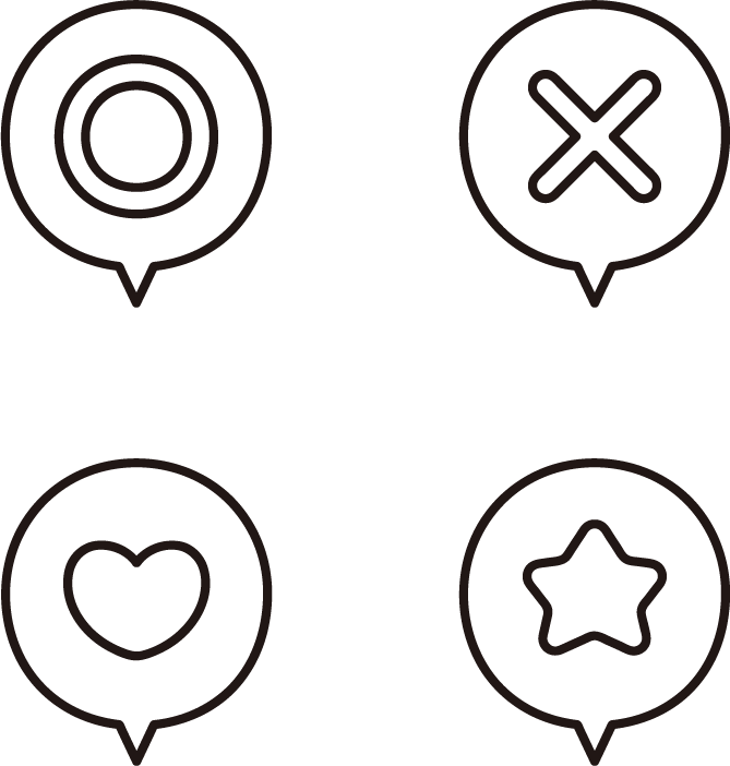 「◯」「✕」「♡」「★」の吹き出しアイコン4種セットです。OK/NG・いいね・お気に入り・おすすめなどのリアクション表現。マル、バツ、ハート、星。