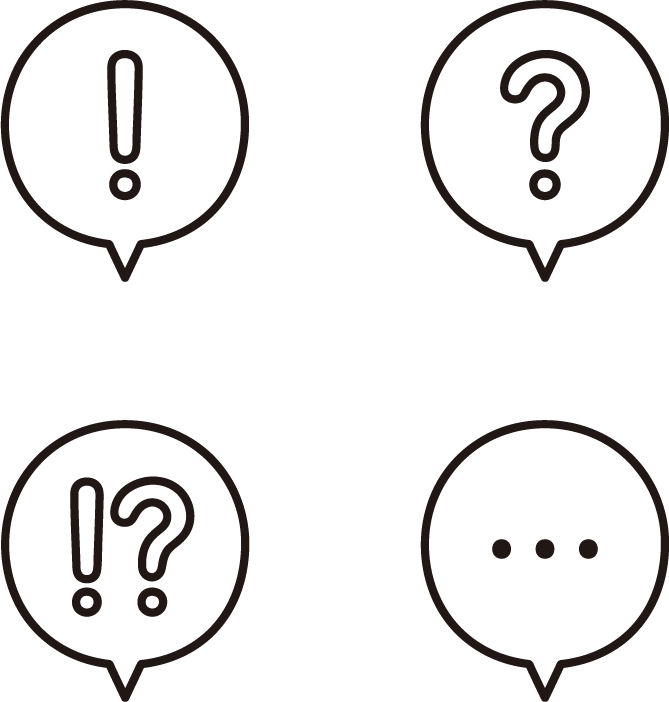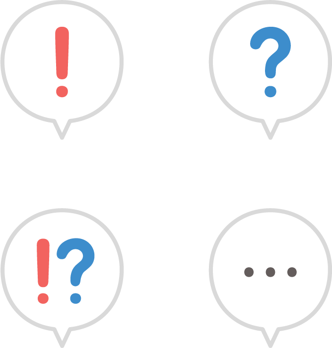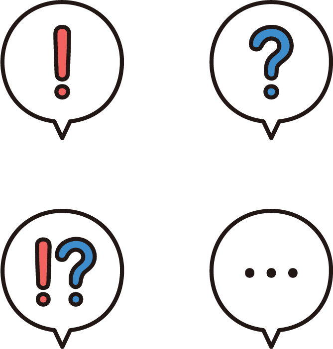 「!」「?」「!?」「…」の吹き出しアイコン4種セットです。驚き・疑問・困惑・沈黙などのリアクション表現。びっくり、はてな。