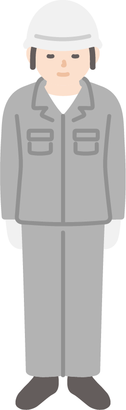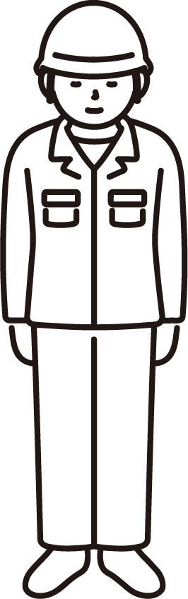 お辞儀をする作業員のイラストです。ヘルメット、作業服、工事。
