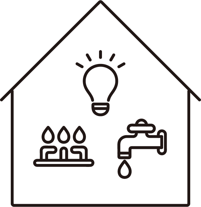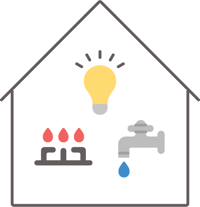 電気・ガス・水道と家を組み合わせ、ライフラインの供給を表したイラストです。