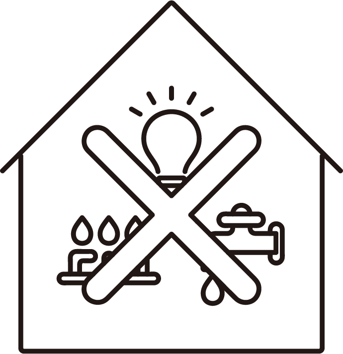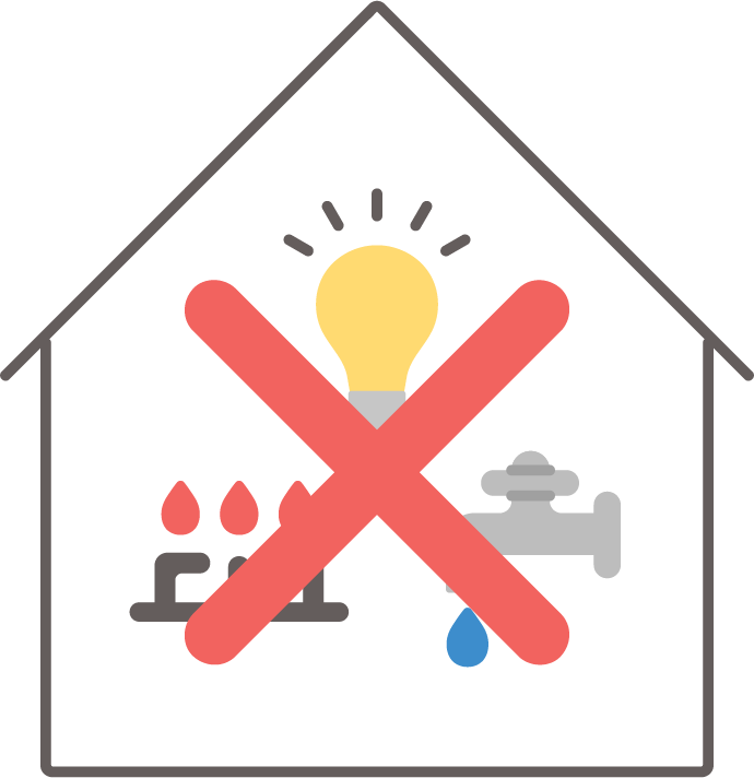 電気・ガス・水道とバツマークを組み合わせ、ライフラインの供給停止を表したイラストです。