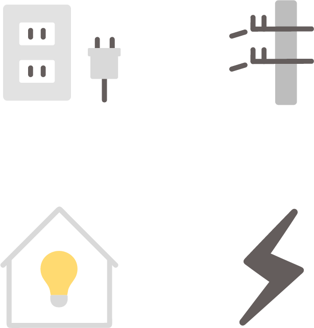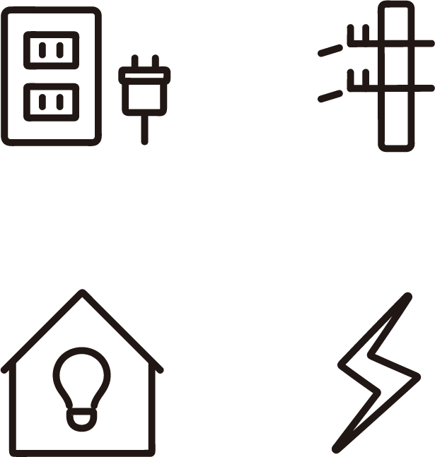 コンセント・電柱・電球と家・雷マークの電気・電力関係のアイコンです。